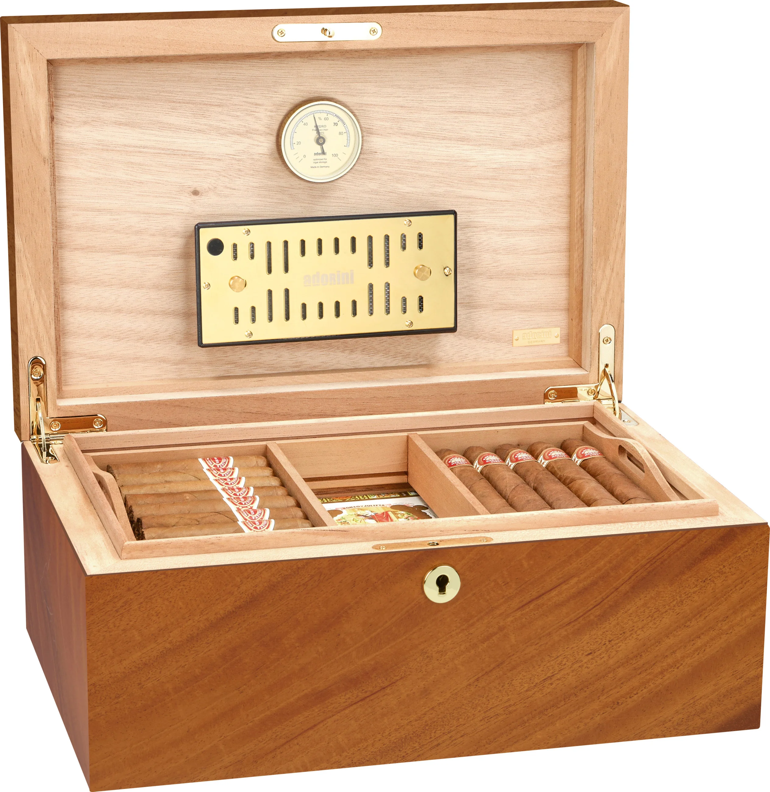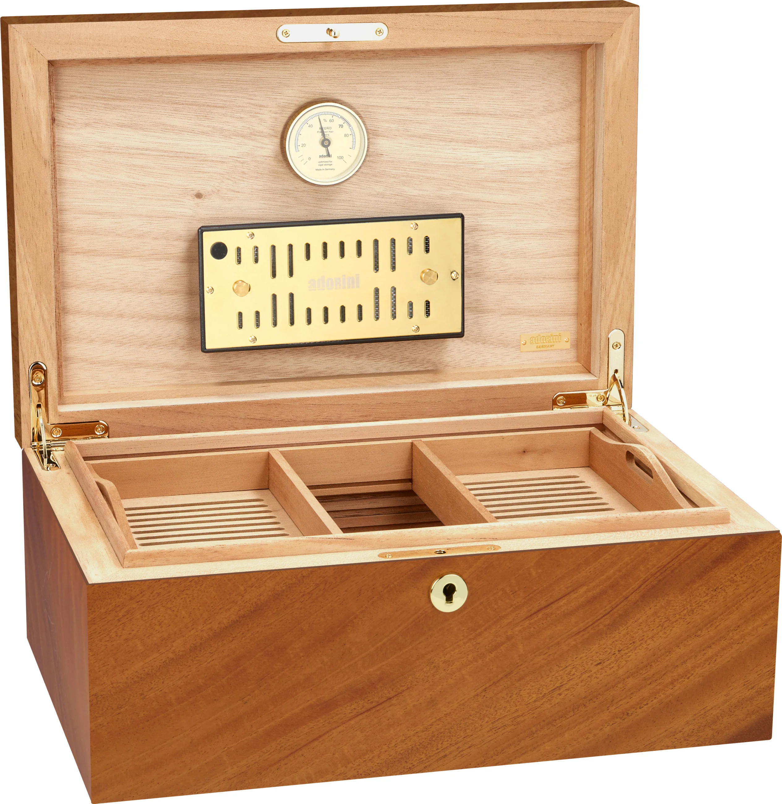 Model od mahagonija zadivljuje toplom smeđom bojom s jasno vidljivim, zakrivljenim šarama, što stvara posebno elegantan izgled i savršeno se uklapa u svako okruženje. Humidori Grande mogu primiti do 150 cigara, nudeći dovoljno prostora za kolekciju zahtjevnih poznavatelja.
