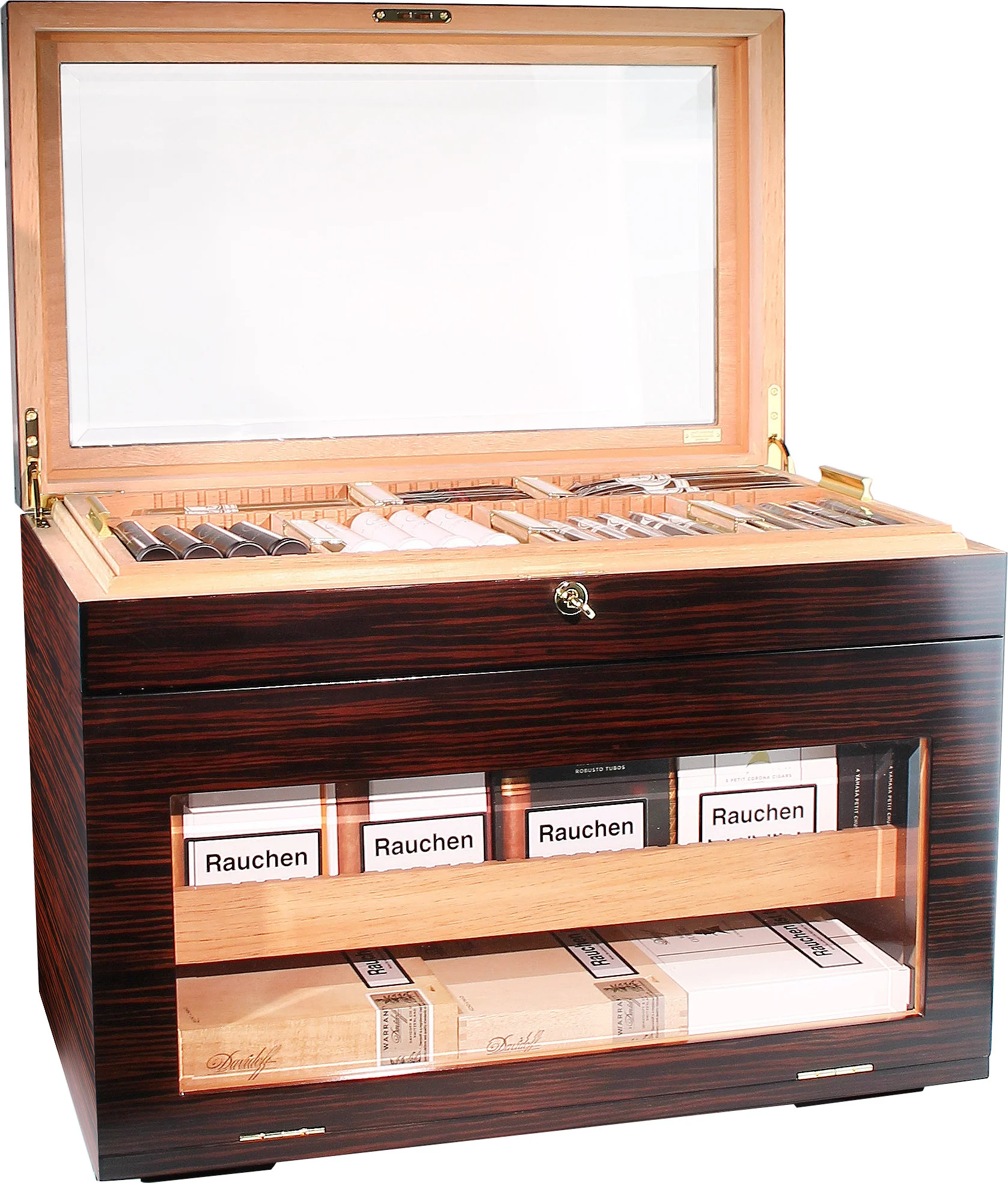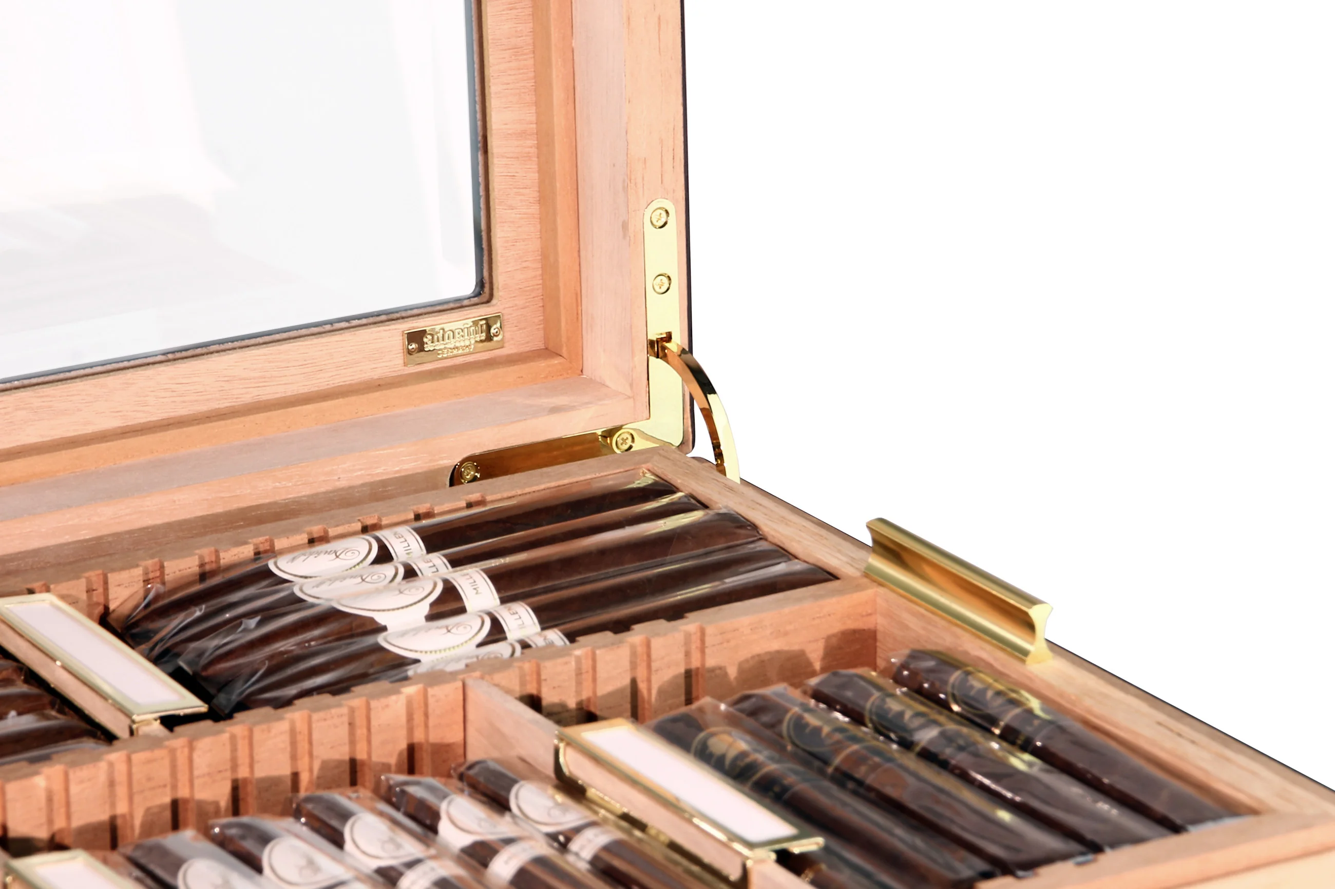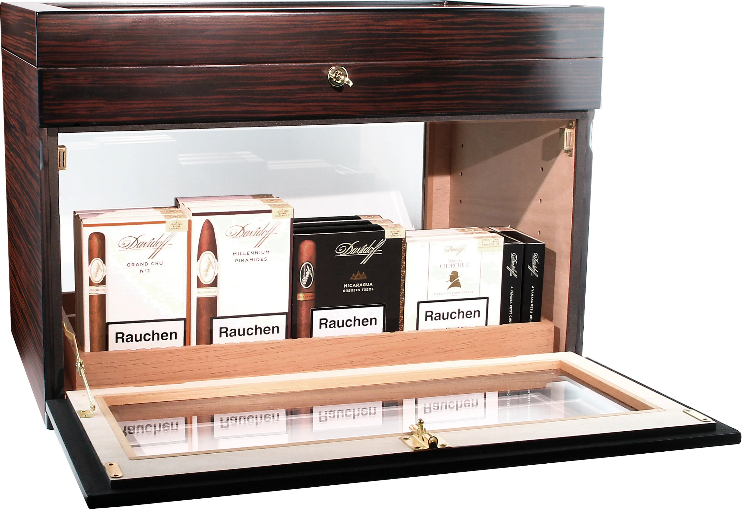 Gornja polica, neposredno ispod staklenog poklopca, fiksna je. Upotrebljava se za pohranu pojedinačnih cigara, može se ukloniti s vrha i idealna je za posluživanje gostiju ili na događajima. Ukrašena elegantnim zlatnim ručkama, ta ladica ostavlja poseban dojam. I ta ladica i ladice ispod nje mogu se fleksibilno podijeliti i organizirati pomoću priloženih razdjelnika.