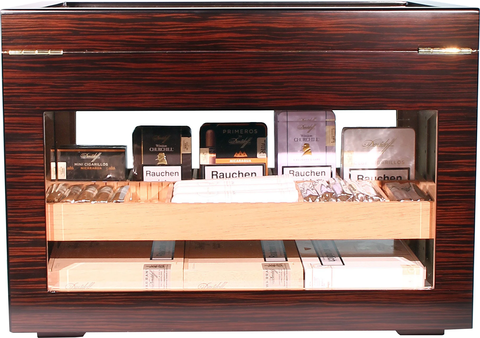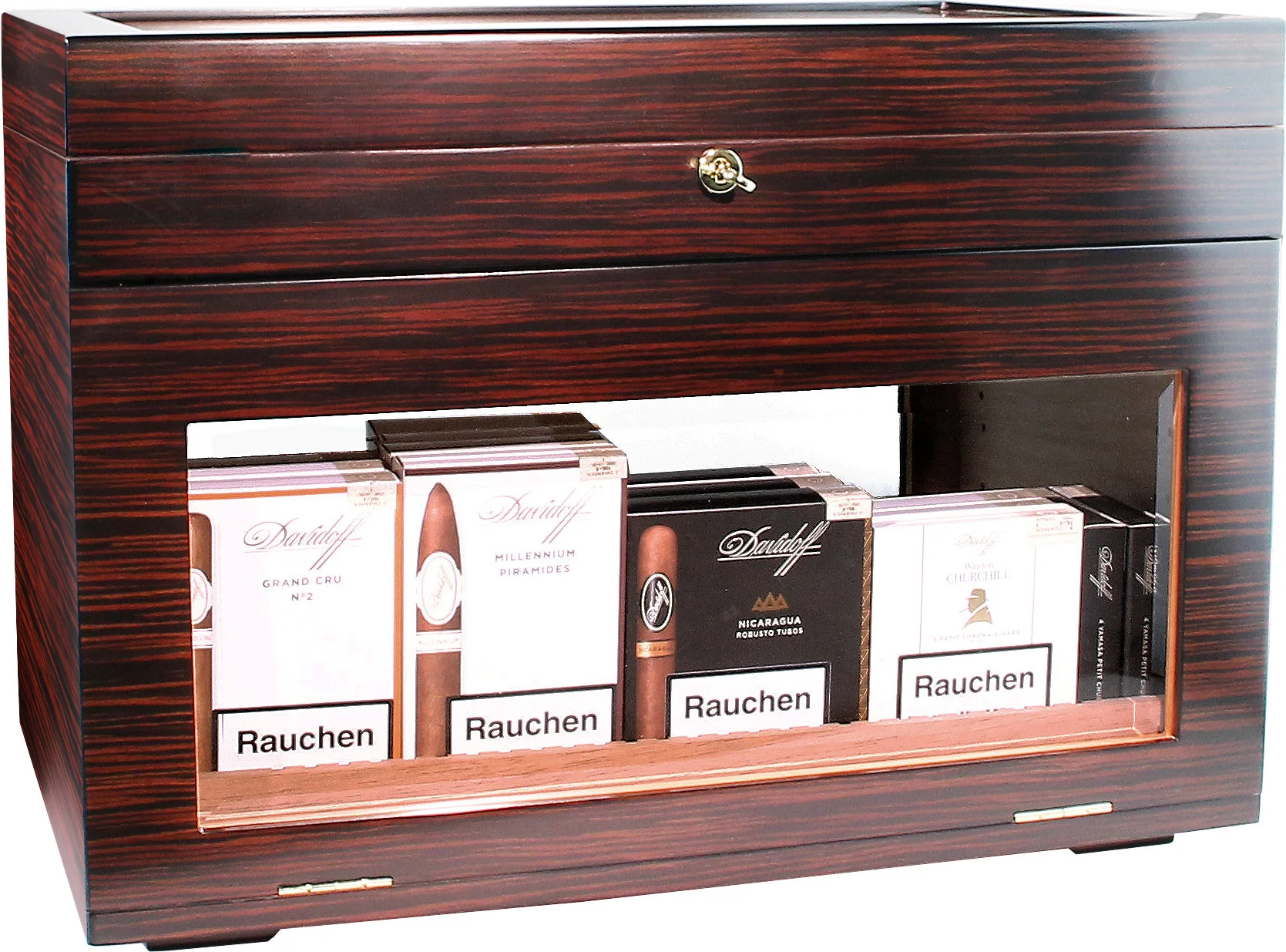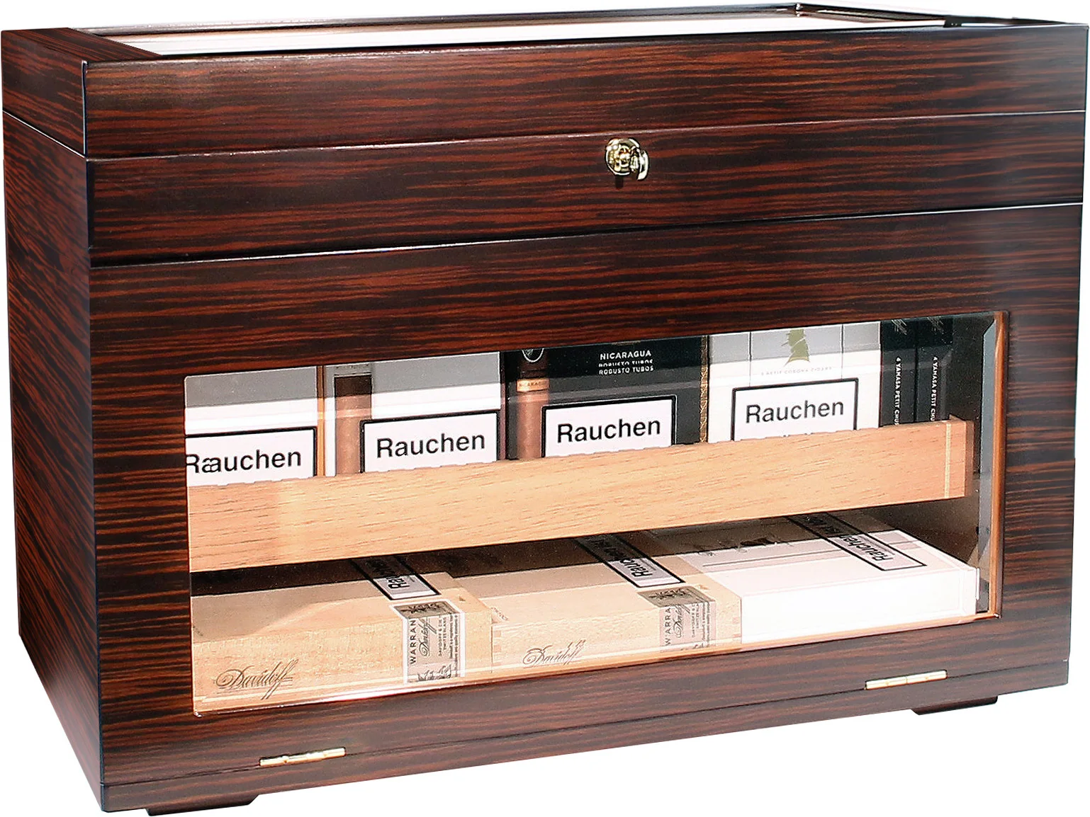 Gornja polica, neposredno ispod staklenog poklopca, fiksna je. Upotrebljava se za pohranu pojedinačnih cigara, može se ukloniti s vrha i idealna je za posluživanje gostiju ili na događajima. Ukrašena elegantnim zlatnim ručkama, ta ladica ostavlja poseban dojam. I ta ladica i ladice ispod nje mogu se fleksibilno podijeliti i organizirati pomoću priloženih razdjelnika.