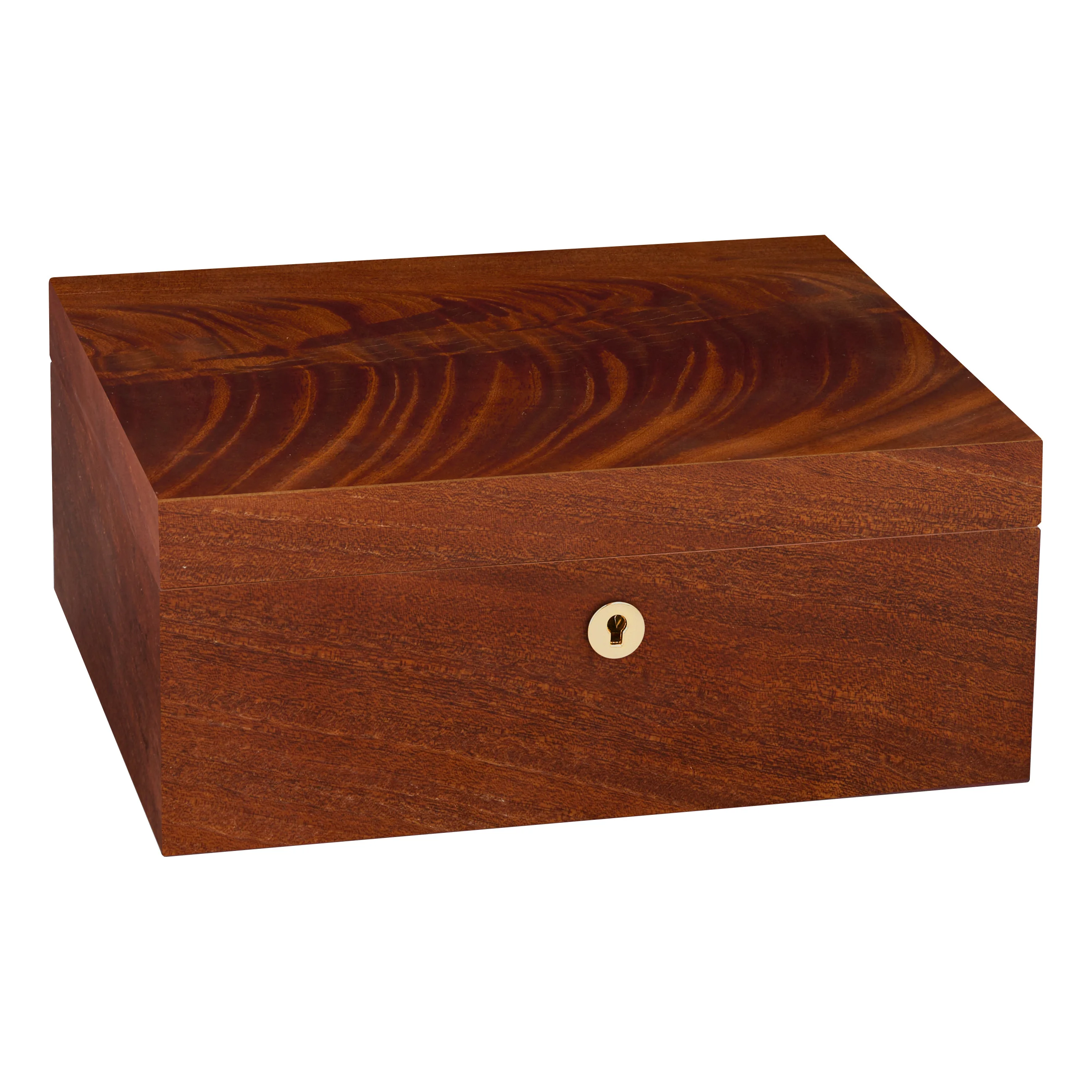 The mahogany wood impresses with its characteristic grain with reddish-brown to dark brown tones, interwoven with striking, flowing grain patterns that give the lid exceptional depth and dynamism. Thanks to its warm appearance, the humidor blends harmoniously into almost any setting. Medium-sized humidors hold up to 75 cigars, providing ample space for your cigar collection.