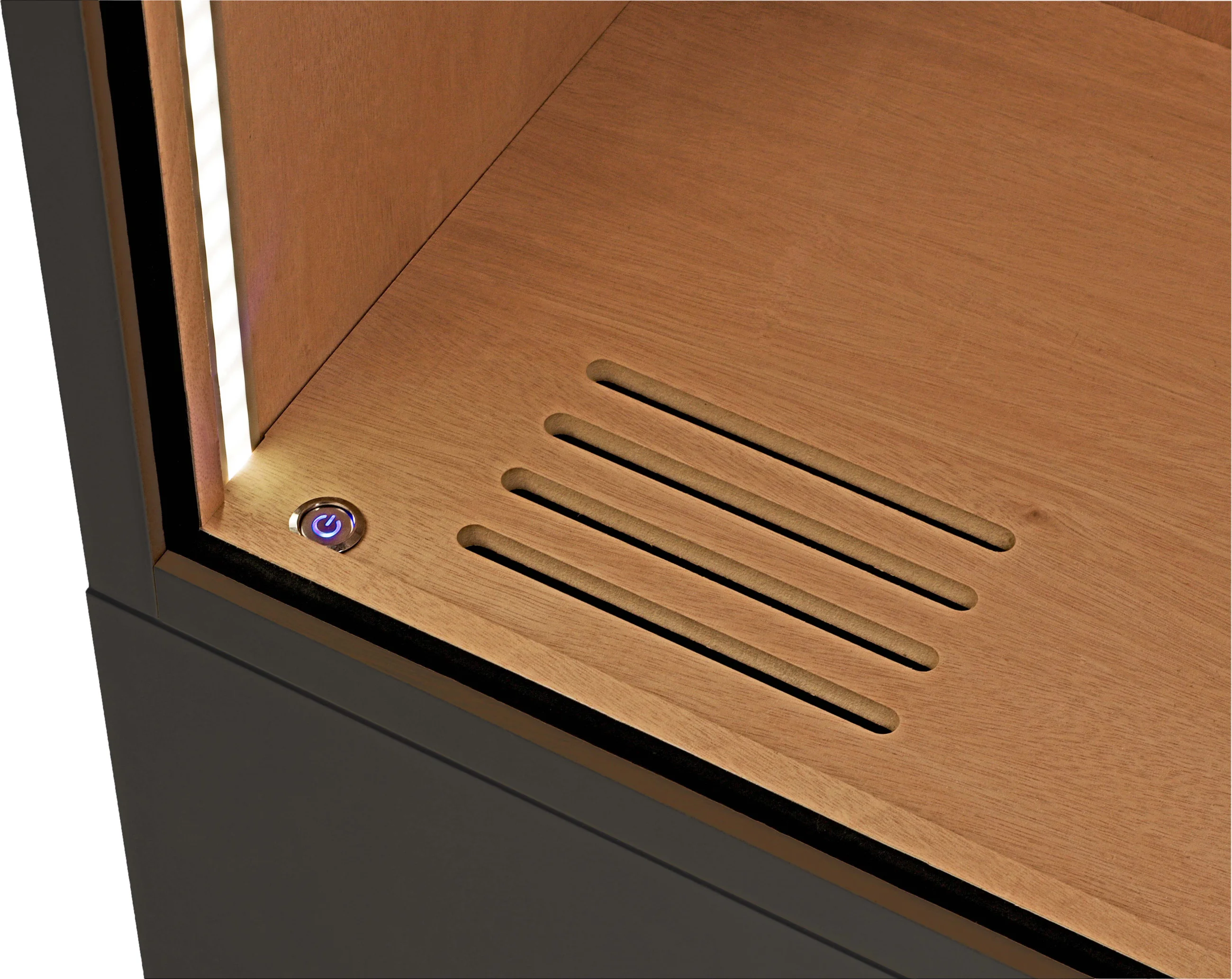 - Unutrašnjost ormarića za humidore izrađena je od furnira od cedrovine i ima drugu stražnju ploču s cirkulacijom zraka.