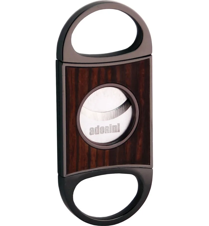 Ekskluzivni rezač za cigare s umetkom od pravog drva Elegantni rezač za cigare marke adorini kombinira sjajnu tamnosivu boju s modernim umetkom od pravog drva izrađenim od ebanovine. Savršena simbioza funkcionalnosti i ekskluzivnog dizajna za zahtjevnog ljubitelja cigara.