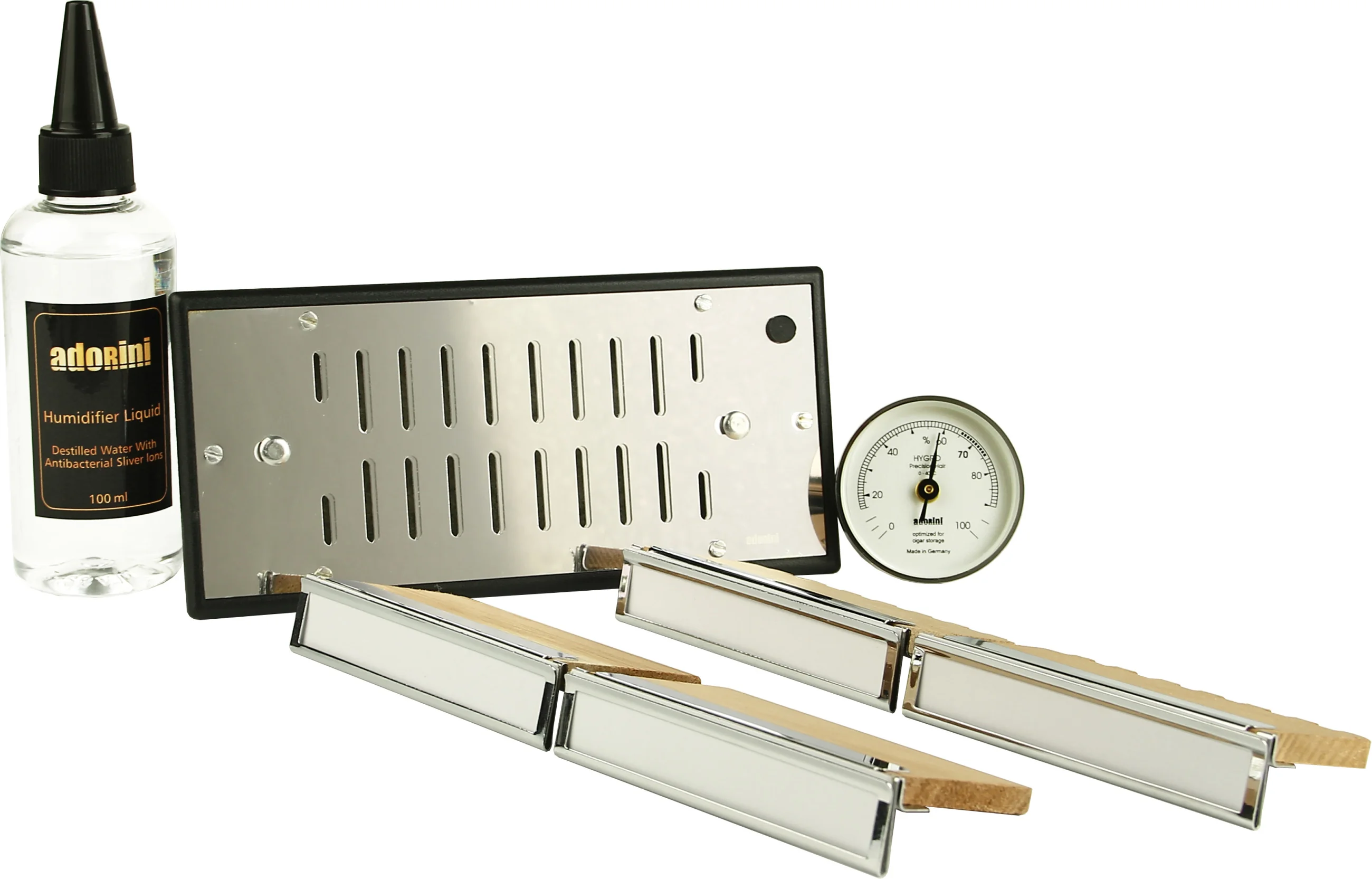 - Tri srebrne kopče za naljepnice koje se mogu pričvrstiti omogućuju vam označavanje ili datiranje pohranjenih cigara za još bolju organizaciju. - Kao dodatak, humidor sadrži otopinu za ovlaživanje Humifit u bočici od 100 ml iz adorinija. To znači da ste dobro pripremljeni da svoj novi humidor odmah stavite u rad.