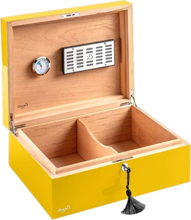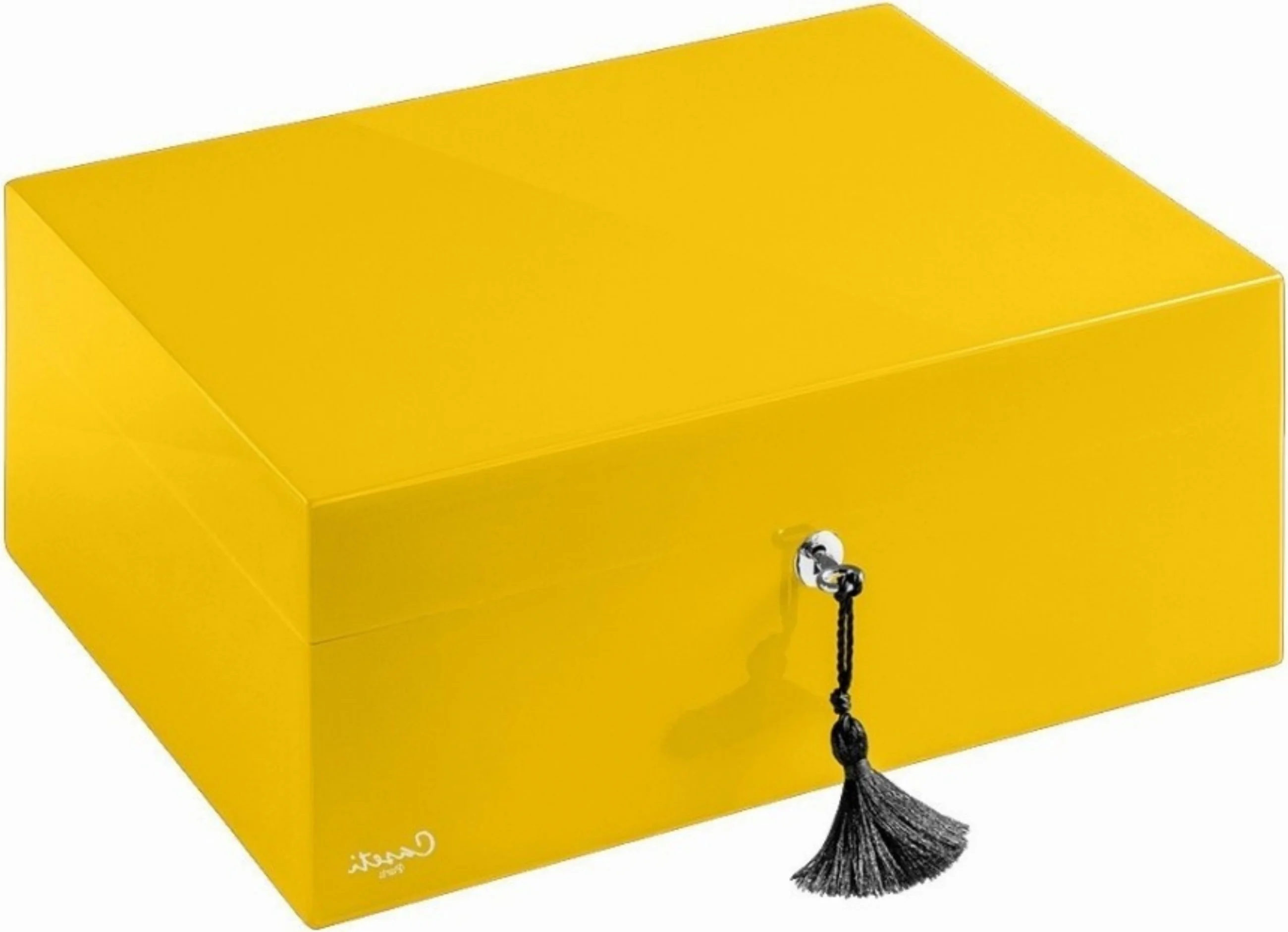 Humidor Caseti Paris u žutoj boji profinjen je humidor francuske marke Caseti koji odmah privlači poglede svojom završnom obradom visokog sjaja. Serija Paris predstavlja žive boje i jasno se ističe od klasičnih, često viđenih humidora s furnirom od drva.
