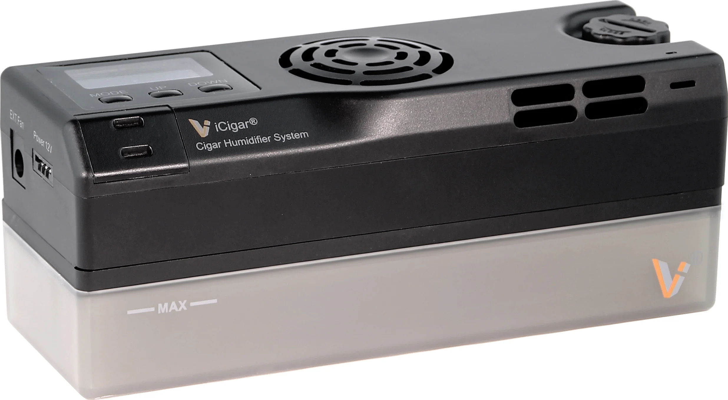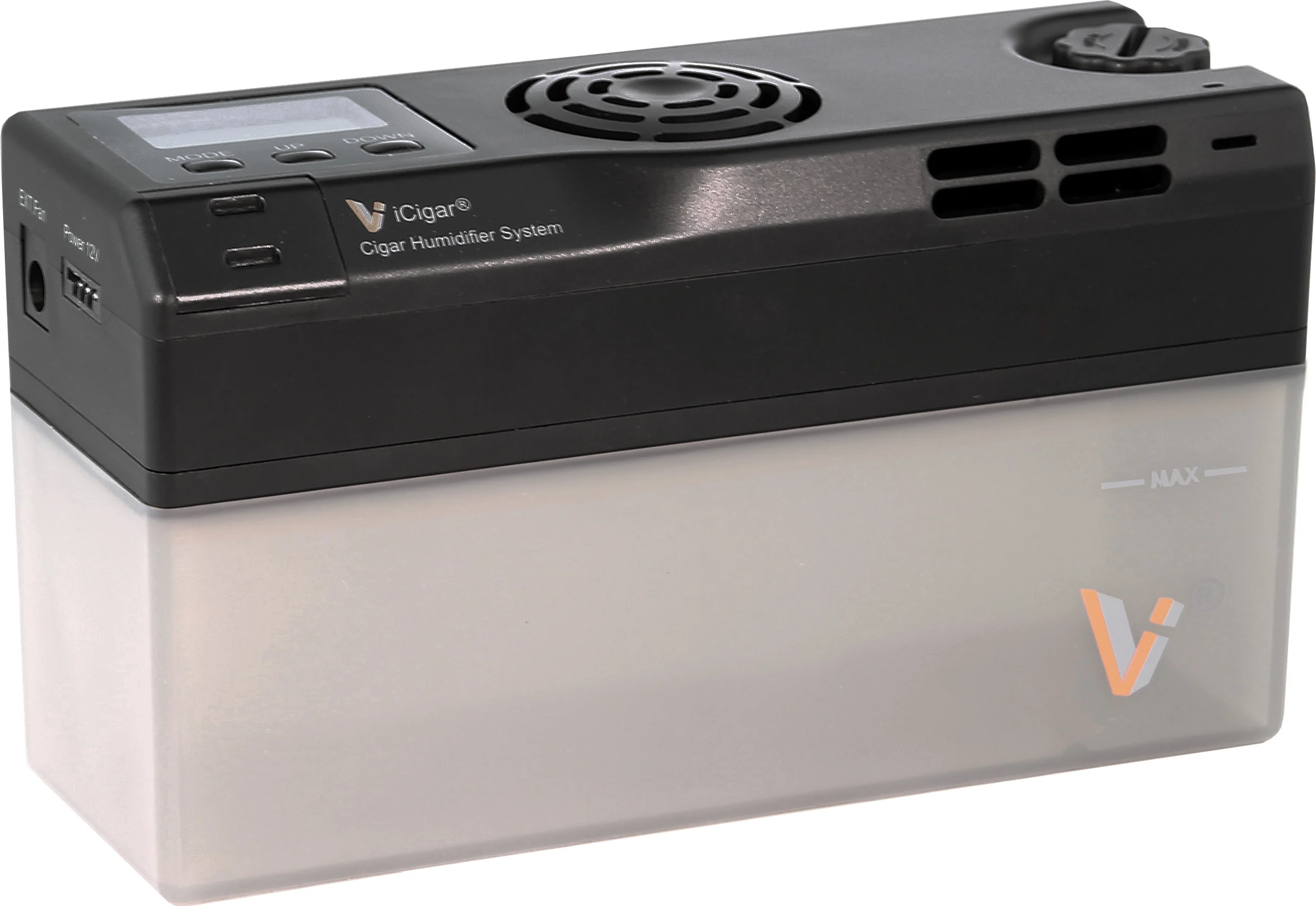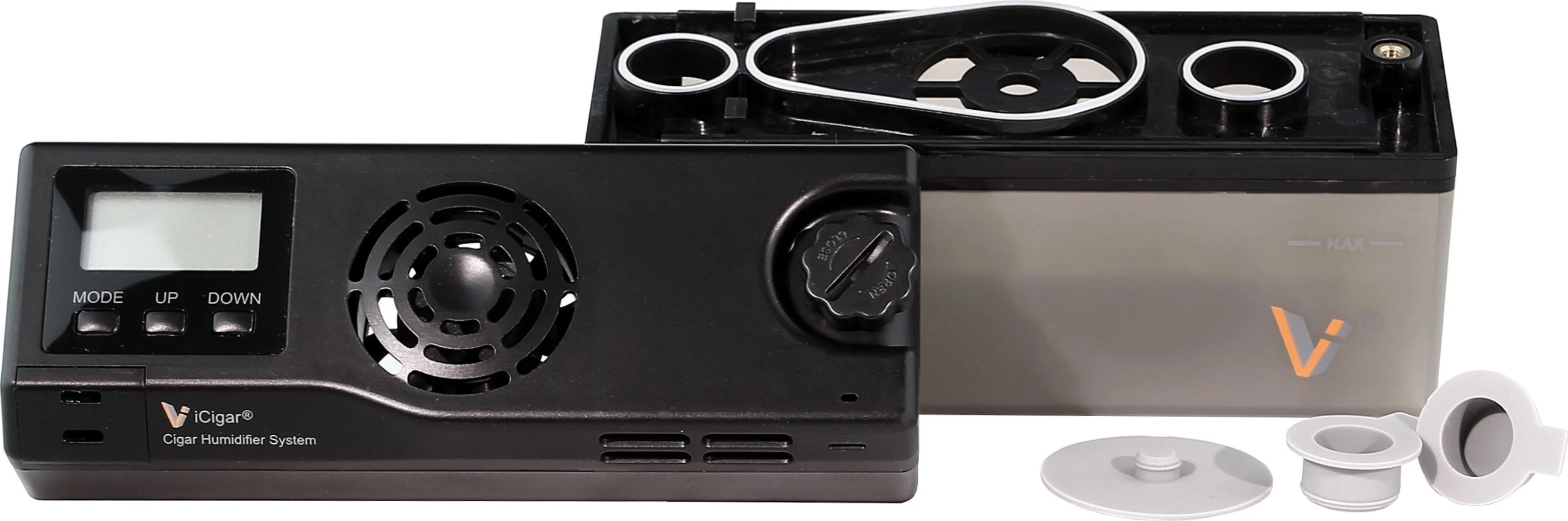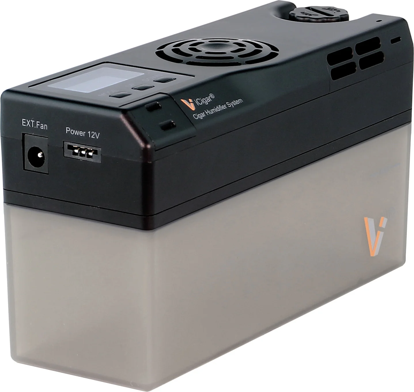 Vlagu raspršuju ventilatori bez četkica smješteni u gornjem dijelu jedinice koja pruža snažno, ali vrlo tiho ovlaživanje do nekoliko mjeseci po ponovnom punjenju. Gornji dio također sadrži snažnu mikroprocesorsku kontrolu i veliki LCD digitalni zaslon koji prikazuje trenutnu vlažnost, temperaturu i visoke i niske razine vlažnosti. Jedinica također prikazuje trodnevni prosjek vlažnosti, dajući vam preciznije očitavanje trenutnog stanja vaših cigara. Tvorničke postavke unaprijed su postavljene na 70 % vlažnosti, ali jedinica dopušta ručnu regulaciju vlažnosti u rasponu od 40 % do 90 %, dajući vam veću fleksibilnost u održavanju cigara na željenoj razini.