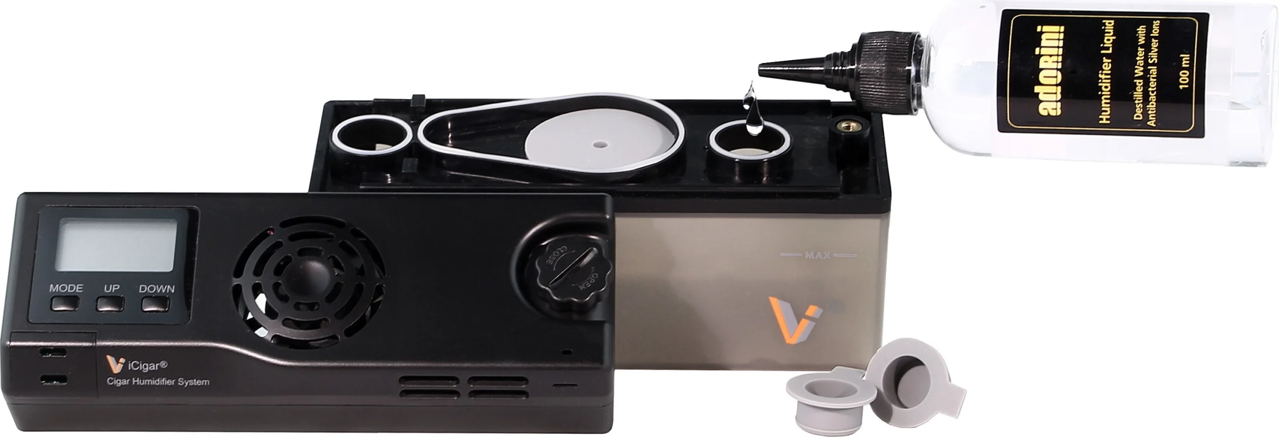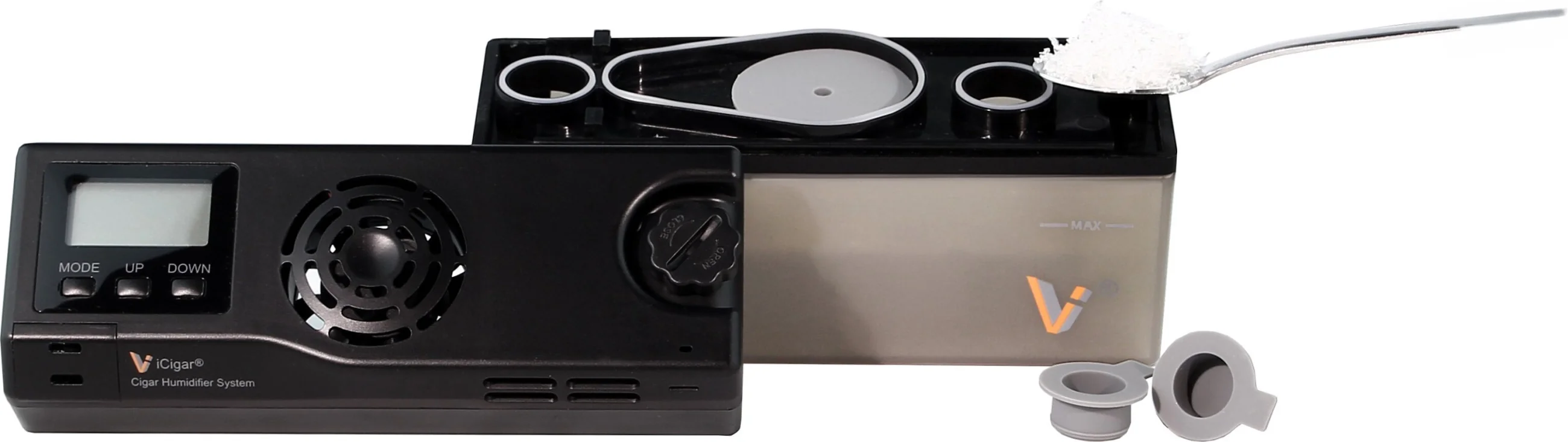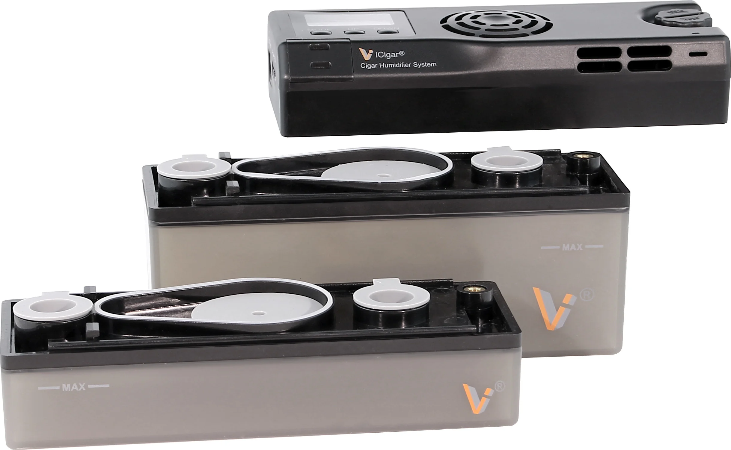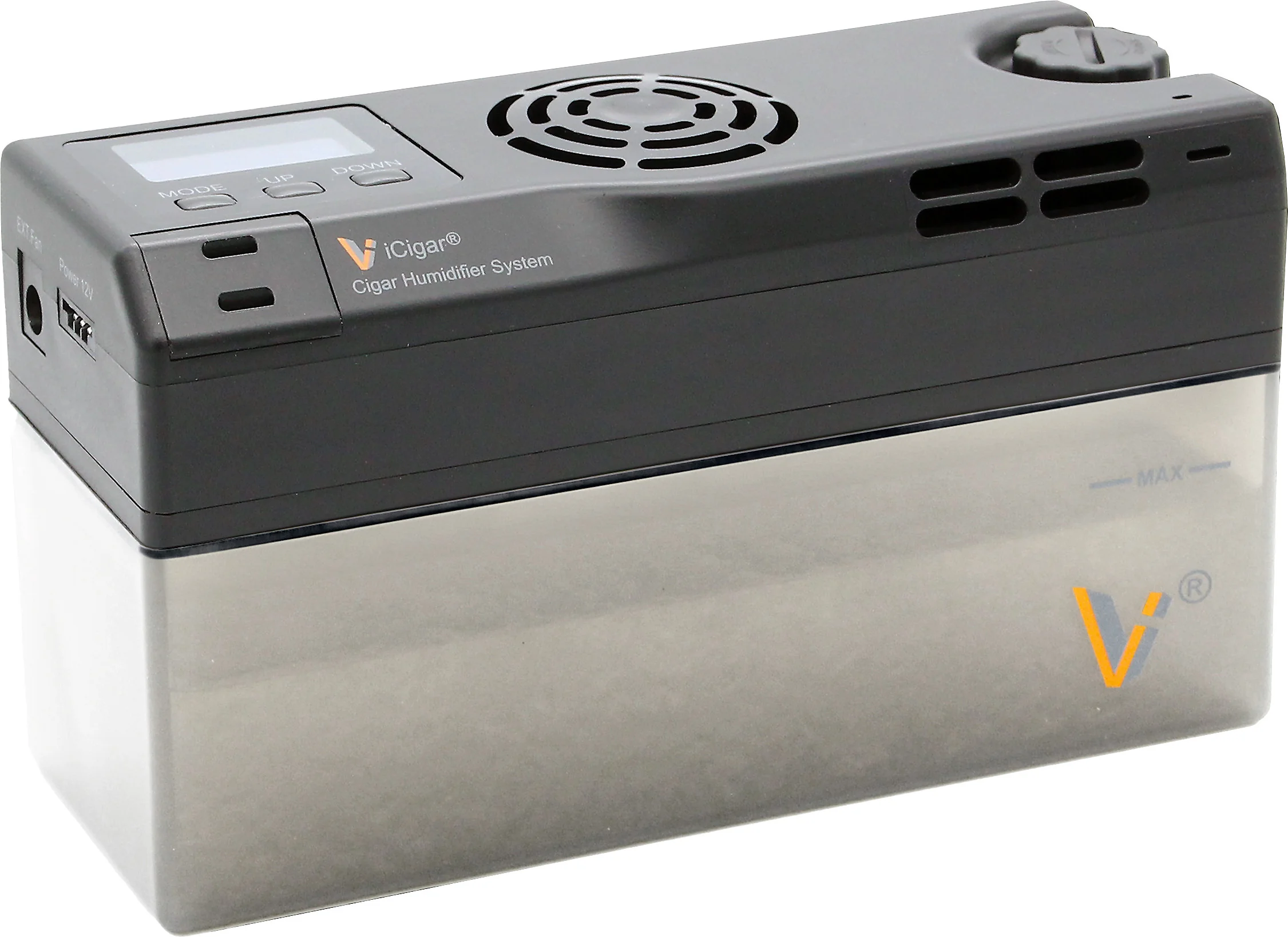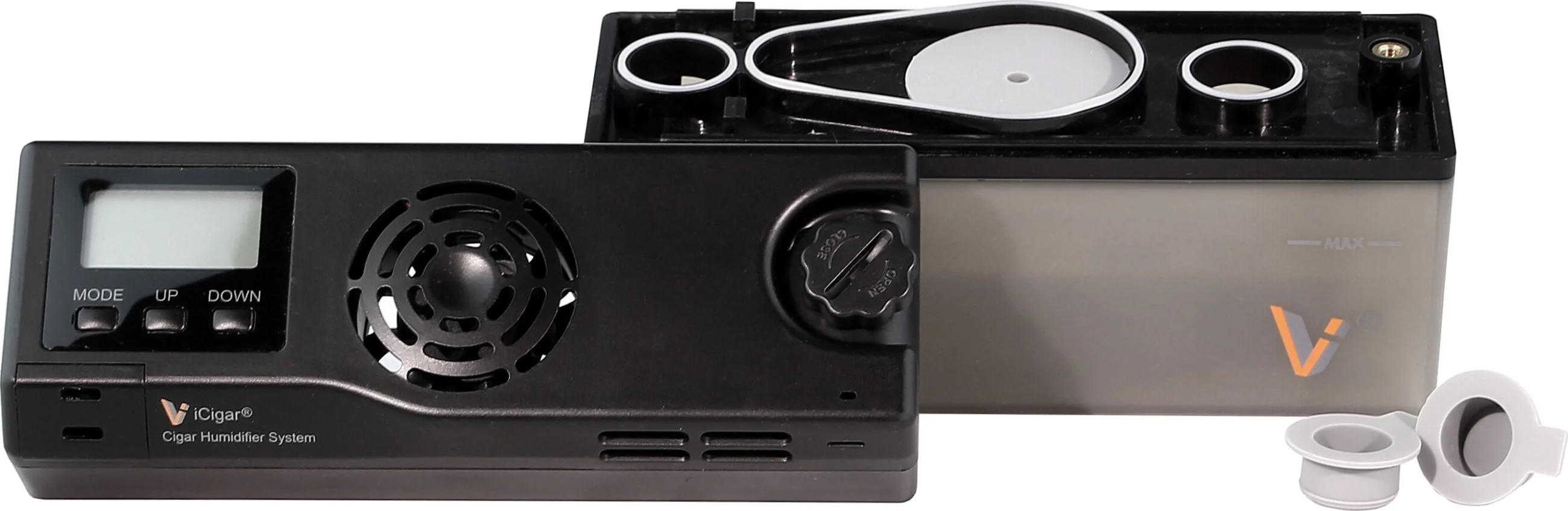 Vlagu raspršuju ventilatori bez četkica smješteni u gornjem dijelu jedinice koja pruža snažno, ali vrlo tiho ovlaživanje do nekoliko mjeseci po ponovnom punjenju. Gornji dio također sadrži snažnu mikroprocesorsku kontrolu i veliki LCD digitalni zaslon koji prikazuje trenutnu vlažnost, temperaturu i visoke i niske razine vlažnosti. Jedinica također prikazuje trodnevni prosjek vlažnosti, dajući vam preciznije očitavanje trenutnog stanja vaših cigara. Tvorničke postavke unaprijed su postavljene na 70 % vlažnosti, ali jedinica dopušta ručnu regulaciju vlažnosti u rasponu od 40 % do 90 %, dajući vam veću fleksibilnost u održavanju cigara na željenoj razini.