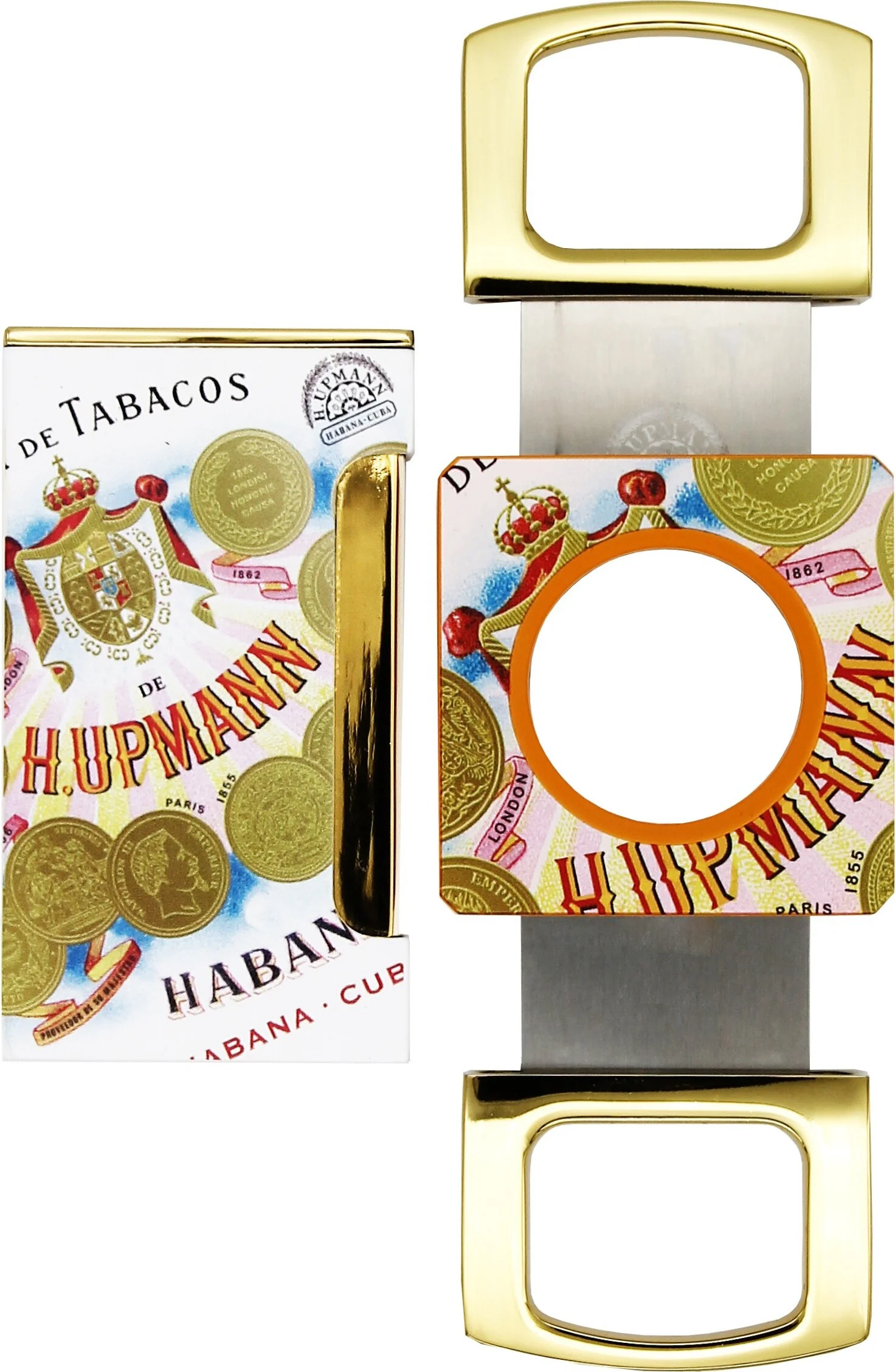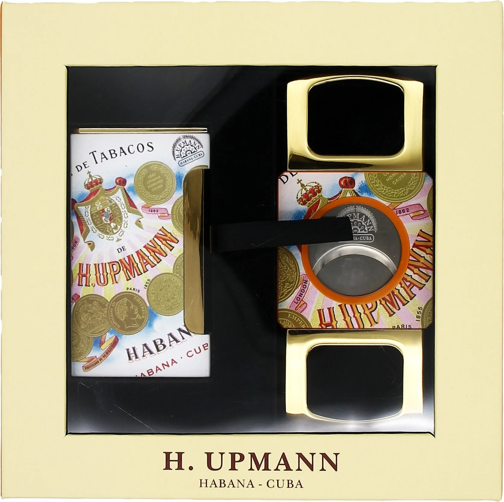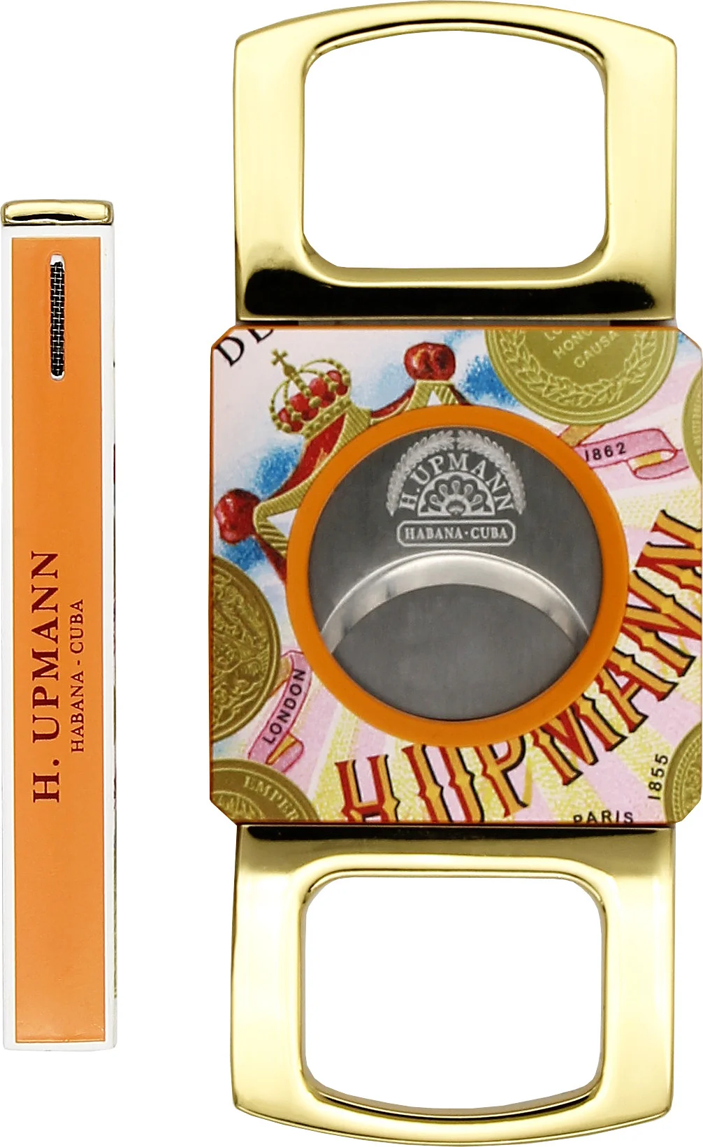 This H. Upmann lighter and cigar cutter set combines two high-quality accessories from the long-established Cuban cigar brand H. Upmann. Both components of the set feature the brand's signature H. Upmann medallion motifs and the brand logo in orange tones on both sides, creating a distinctive and iconic look.