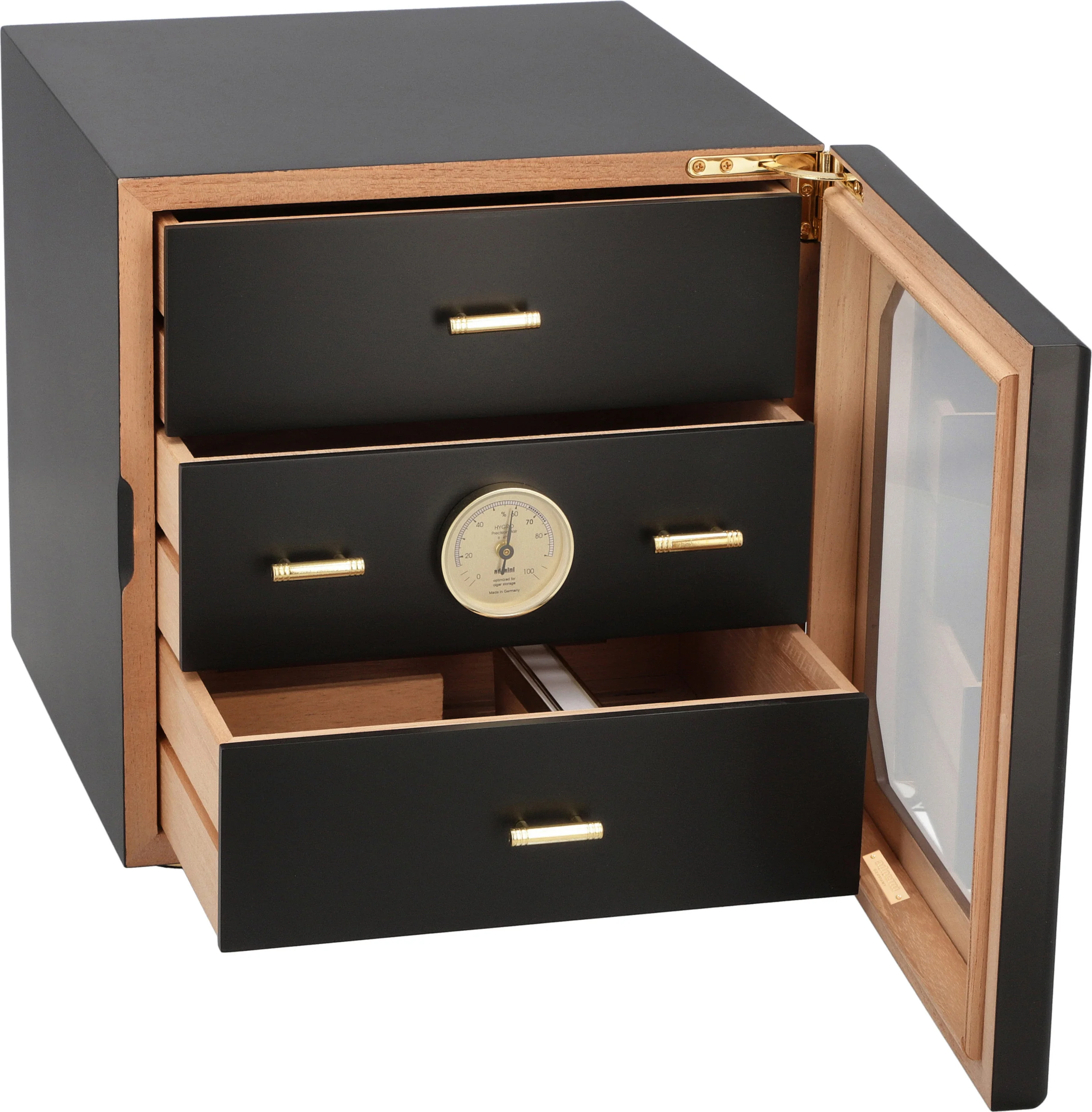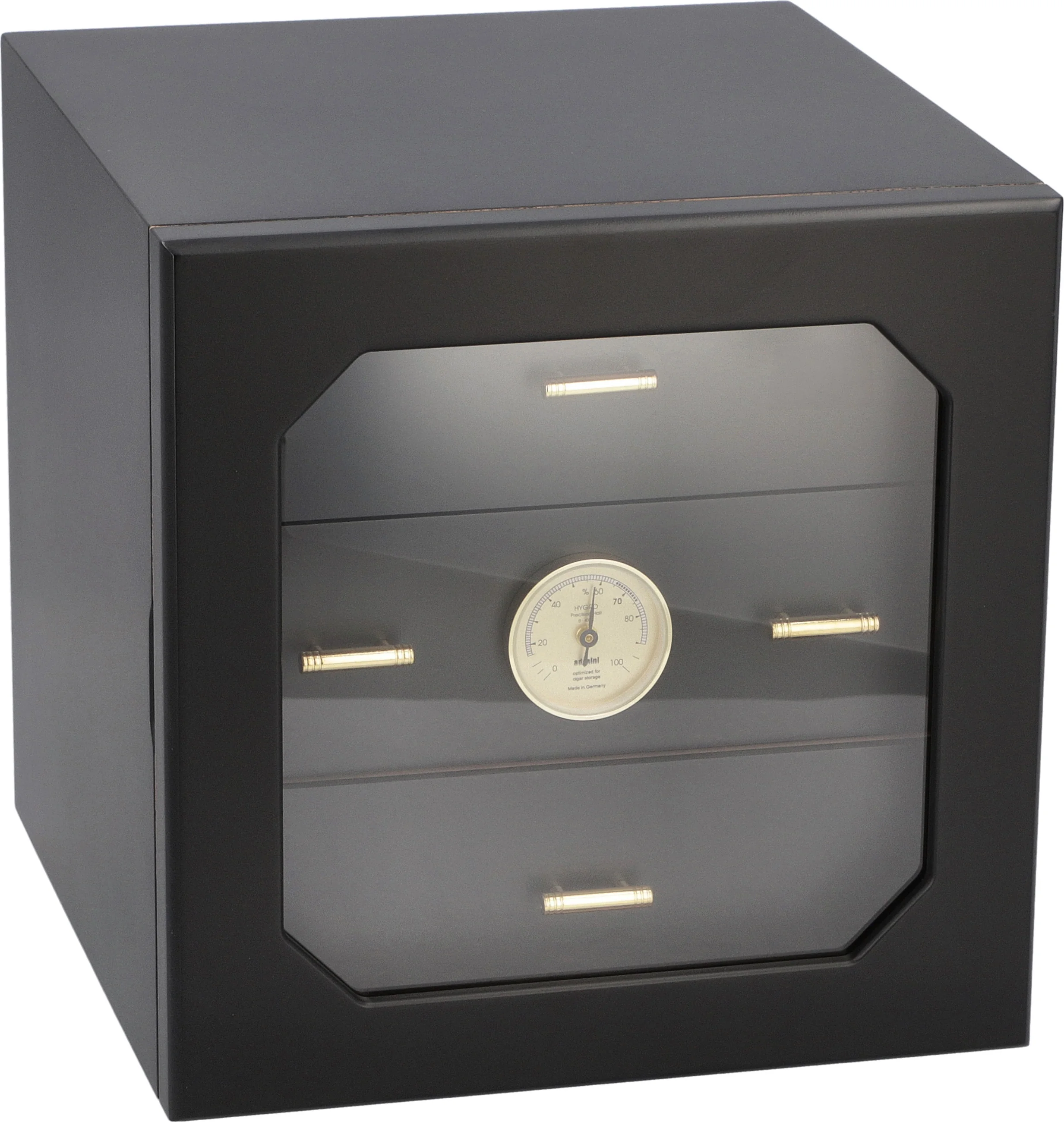 Ovaj iznimno popularni ormarić za humidor unosi elegantnu simetriju u iskustvo pohrane cigara s elegantnim, ali funkcionalnim dizajnom u obliku kocke. Višestruko lakirana mat završna obrada spaja pozlaćene detalje i staklenu ploču za gledanje ugrađenu u vrata kako bi humidor bio učinkovit i ugodan dodatak svakom uređenju. Više od 100 cigara veličine Corone bit će sigurno pohranjeno u tri klizne ladice humidora od parene španjolske cedrovine.