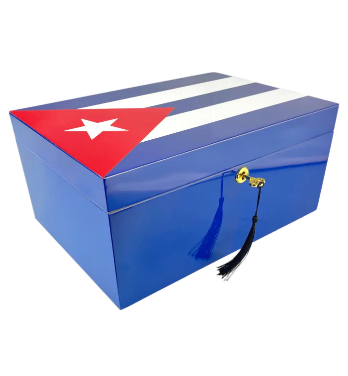 Uronite u svijet kulture cigara s ovim izvrsnim humidorom za cigare ukrašenim kubanskom zastavom. Taj prekrasni humidor posveta je bogatoj tradiciji kubanskih cigara i pruža vam savršeno okruženje za elegantnu pohranu do 100 vaših dragocjenih cigara.
