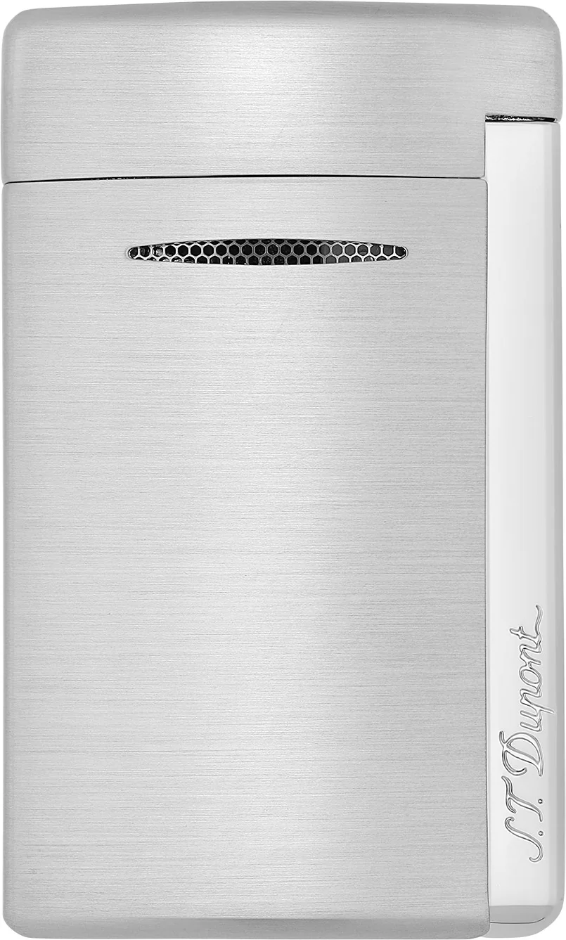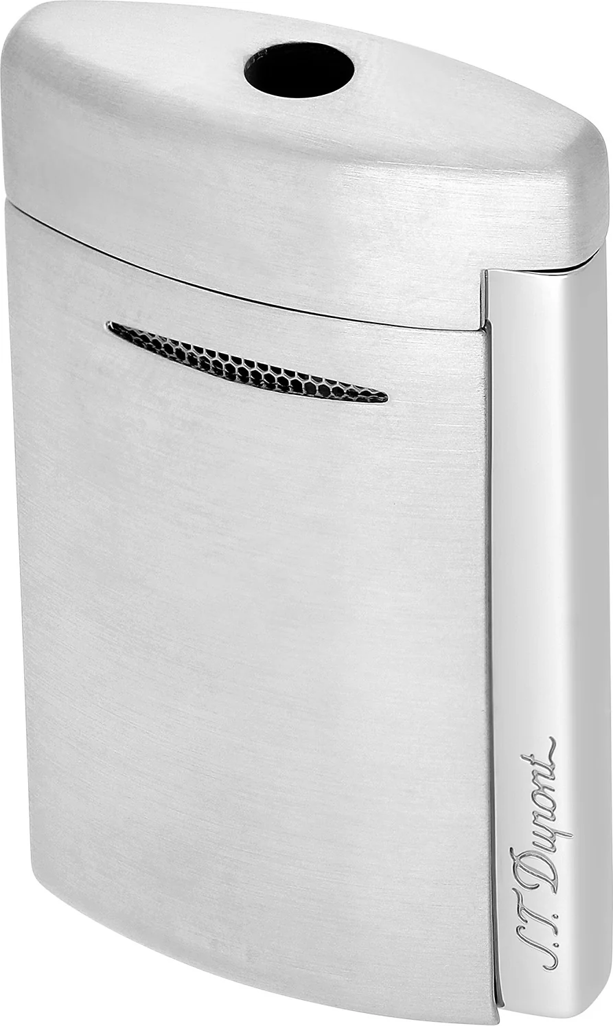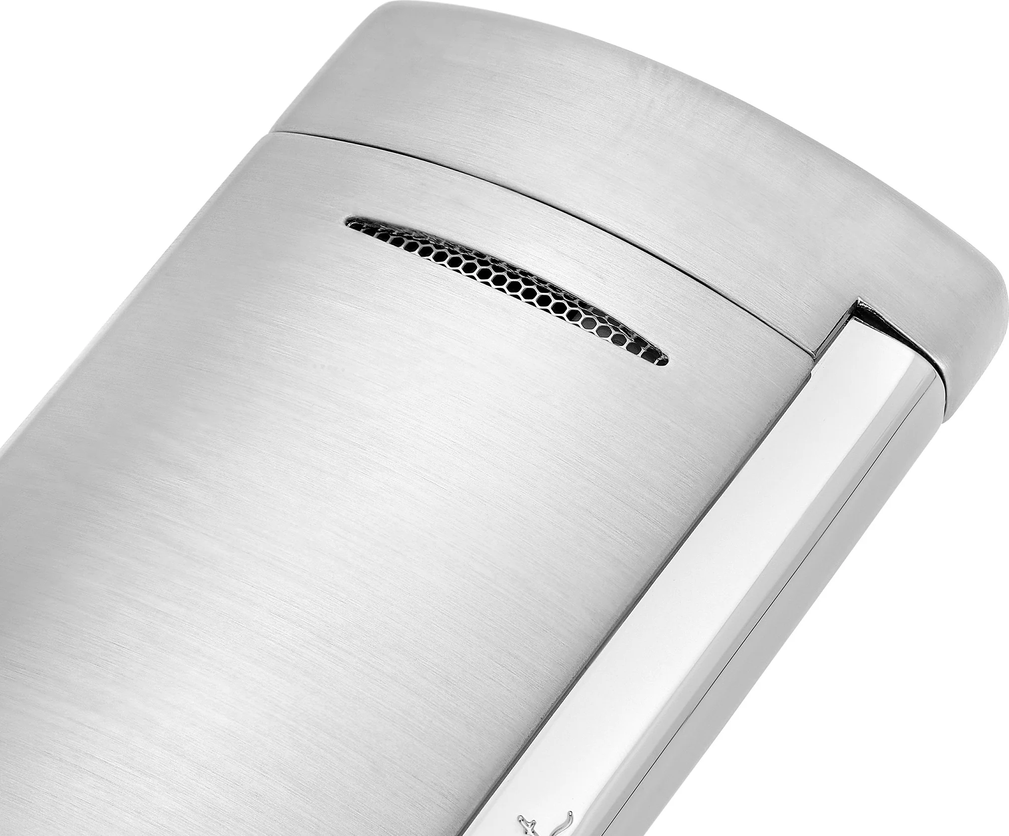 Upaljač S. T. Dupont Minijet u brušenoj kromiranoj boji sa sjajnim detaljima profinjen je i praktičan upaljač koji zadivljuje svojim snažnim mlaznim plamenom i električnim piezo paljenjem. Brušena završna obrada s poliranim kromiranim detaljima čini ga elegantnim dodatkom za svakodnevnu upotrebu.
