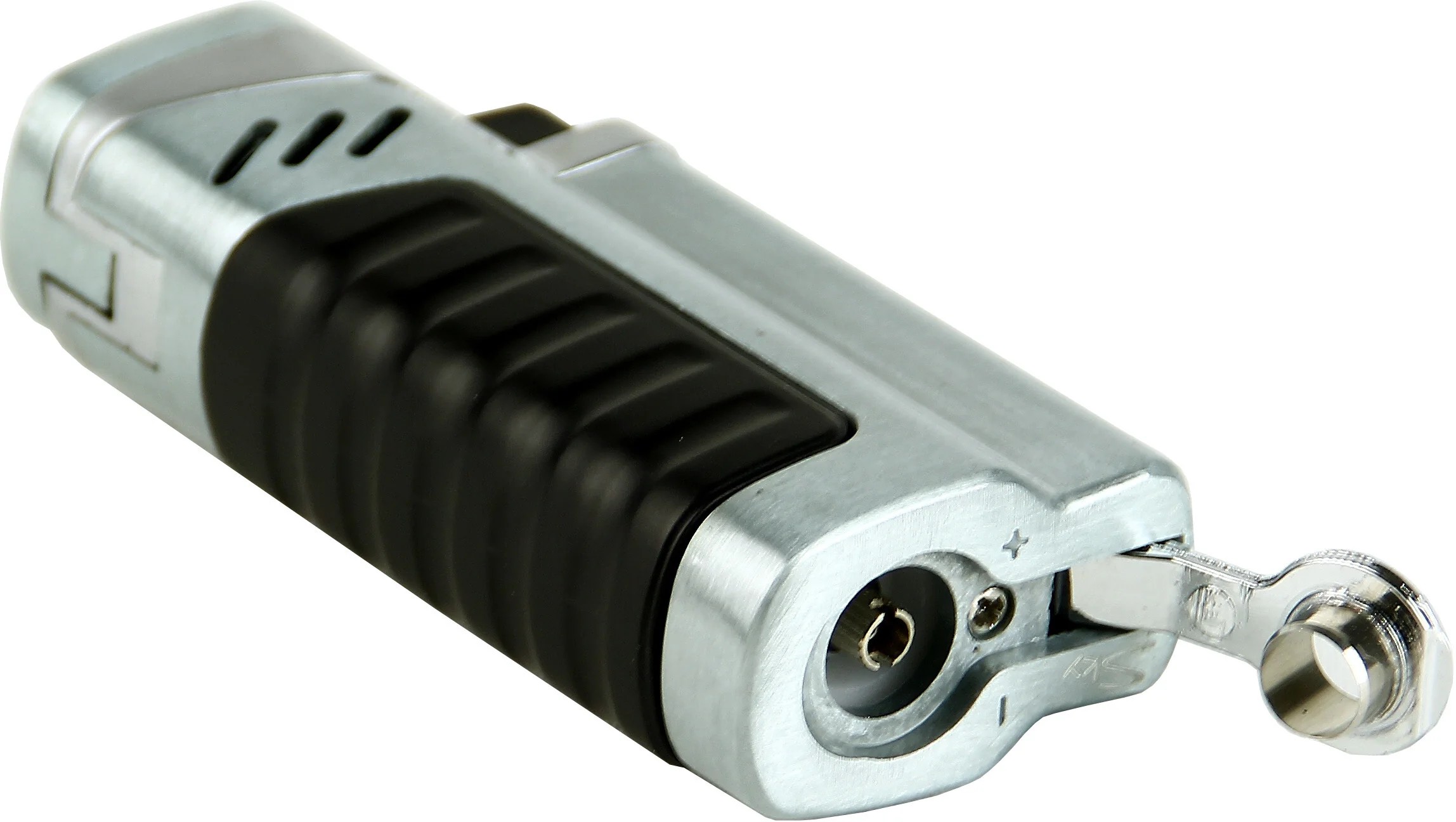 - Elegantan kromirani dizajn: Upaljač ima elegantno kromirano kućište s crnim elementima na drški i spaja estetiku s funkcionalnošću.